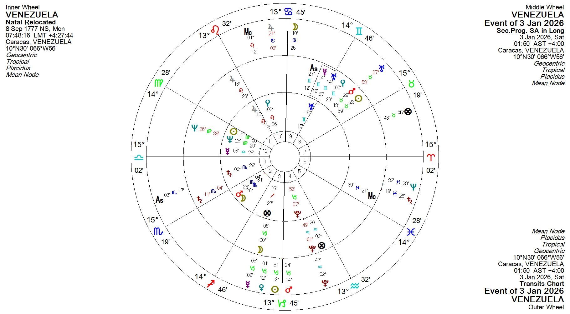 We can see from the above chart that Venezuela’s natal Pluto is also at 27 degrees but its progressed Pluto is at 1 degree. It has had a much longer Pluto effect than the US, lasting from 2022 until now. Indeed we have seen the political and economic issues that have dogged the country over the last few years ( Pluto has also been square the natal Saturn making the hardships much worse). Pluto has, in fact, only recently encountered its last exact transit to the progressed Pluto point. This may indicate the story of the developments which led to the opposition cooperating under the leadership of Machado.